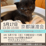 2024年2月20日 / 最終更新日時 : 2026年4月19日 早川由美 お知らせ 5月17日京都譲渡会 5月17日京都譲渡会開催します🐈⬛🐈 予約不要です 皆様のご来場お待ちしております ___________________ 開催日:4月19日 開催時間:13時30分〜15時 開催場所:ファミリーマート京阪七条店2階 […]