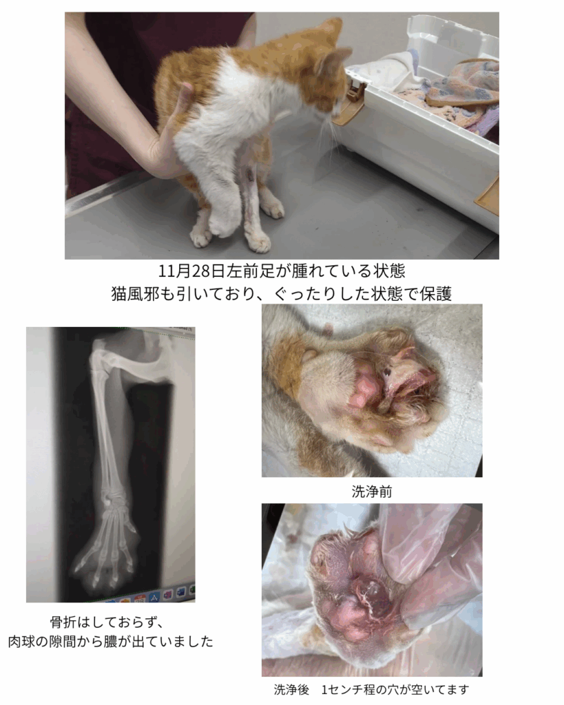 11月28日保護 生後6ヶ月なのに平均の半分以下の1.1キロで保護 右前脚に腫れ、風邪症状があるため現在約3週間(11/28~)の入院治療中です