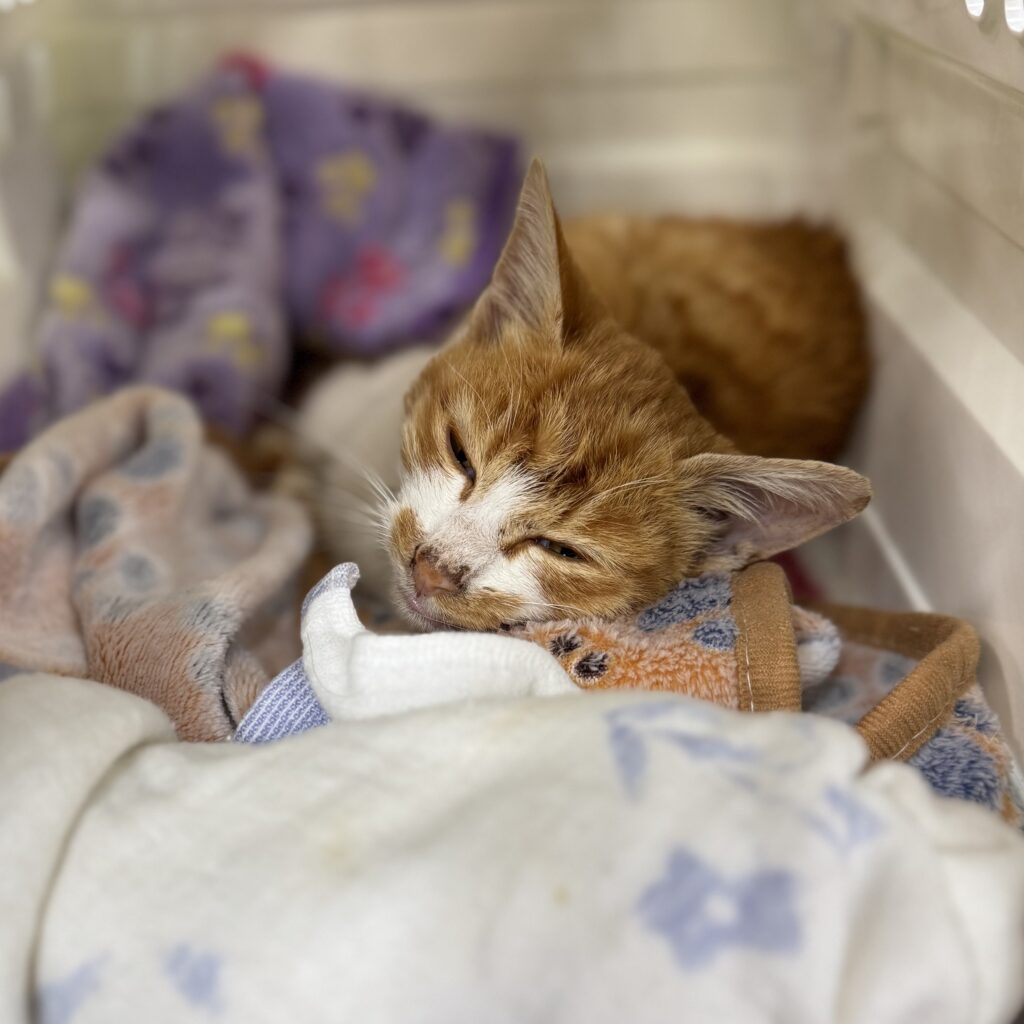 11月28日保護 生後6ヶ月なのに平均の半分以下の1.1キロで保護 右前脚に腫れ、風邪症状があるため現在約3週間(11/28~)の入院治療中です